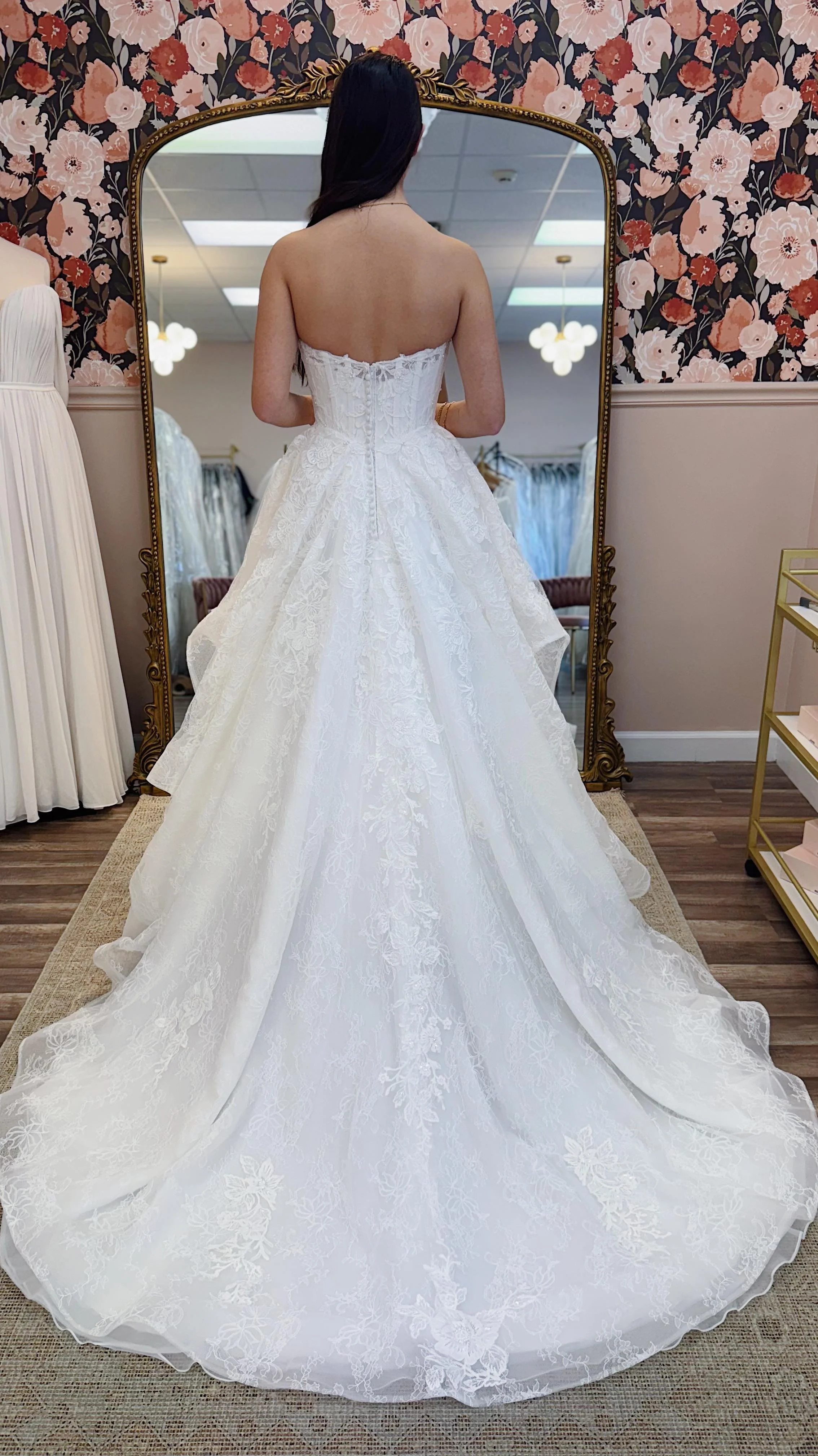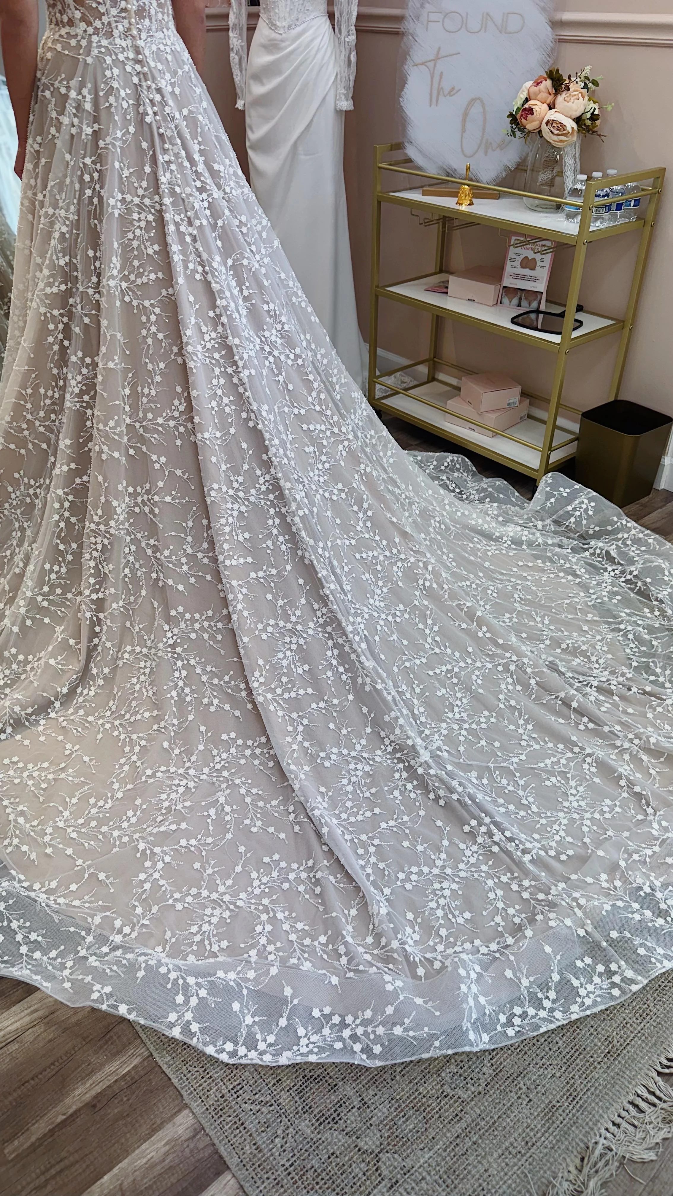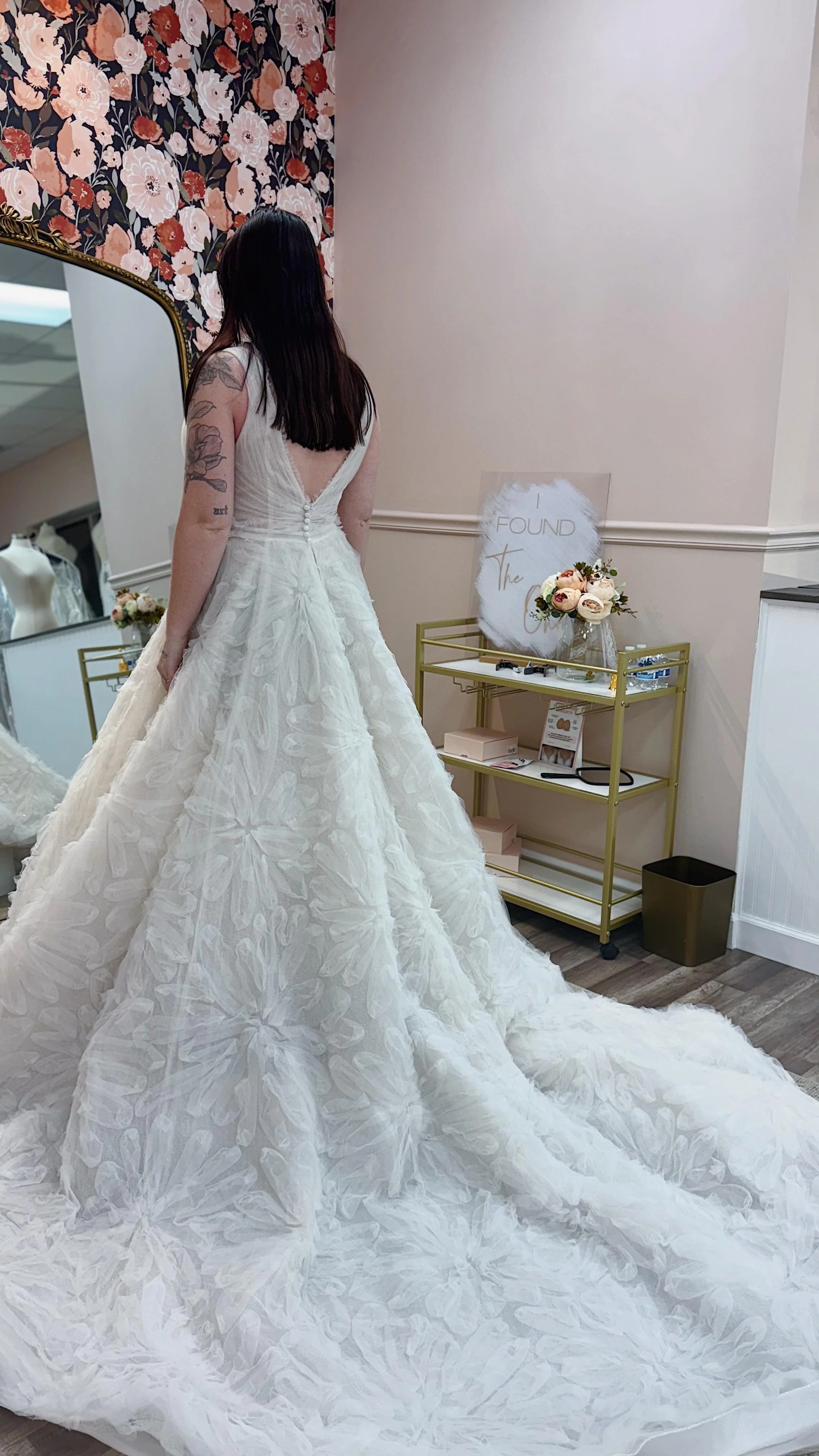 A majority of our bridal gowns were previous sample gowns from Something Blue. They have never been worn down the aisle by another bride. Wear and tear varies by how much they were tried on, pricing reflects the condition of each dress. We also carry a private designer which are brand new gowns bought exclusively for The One.