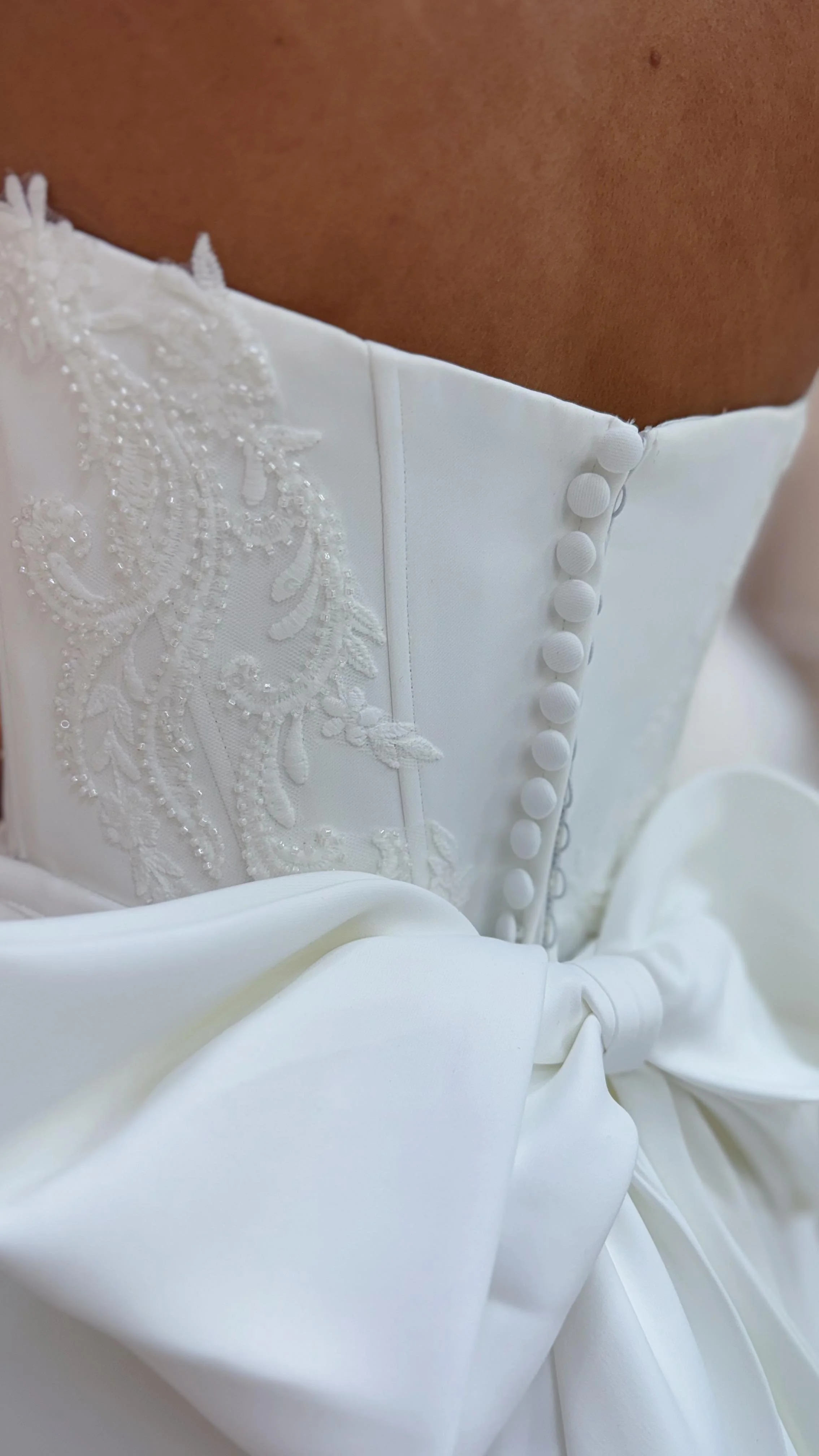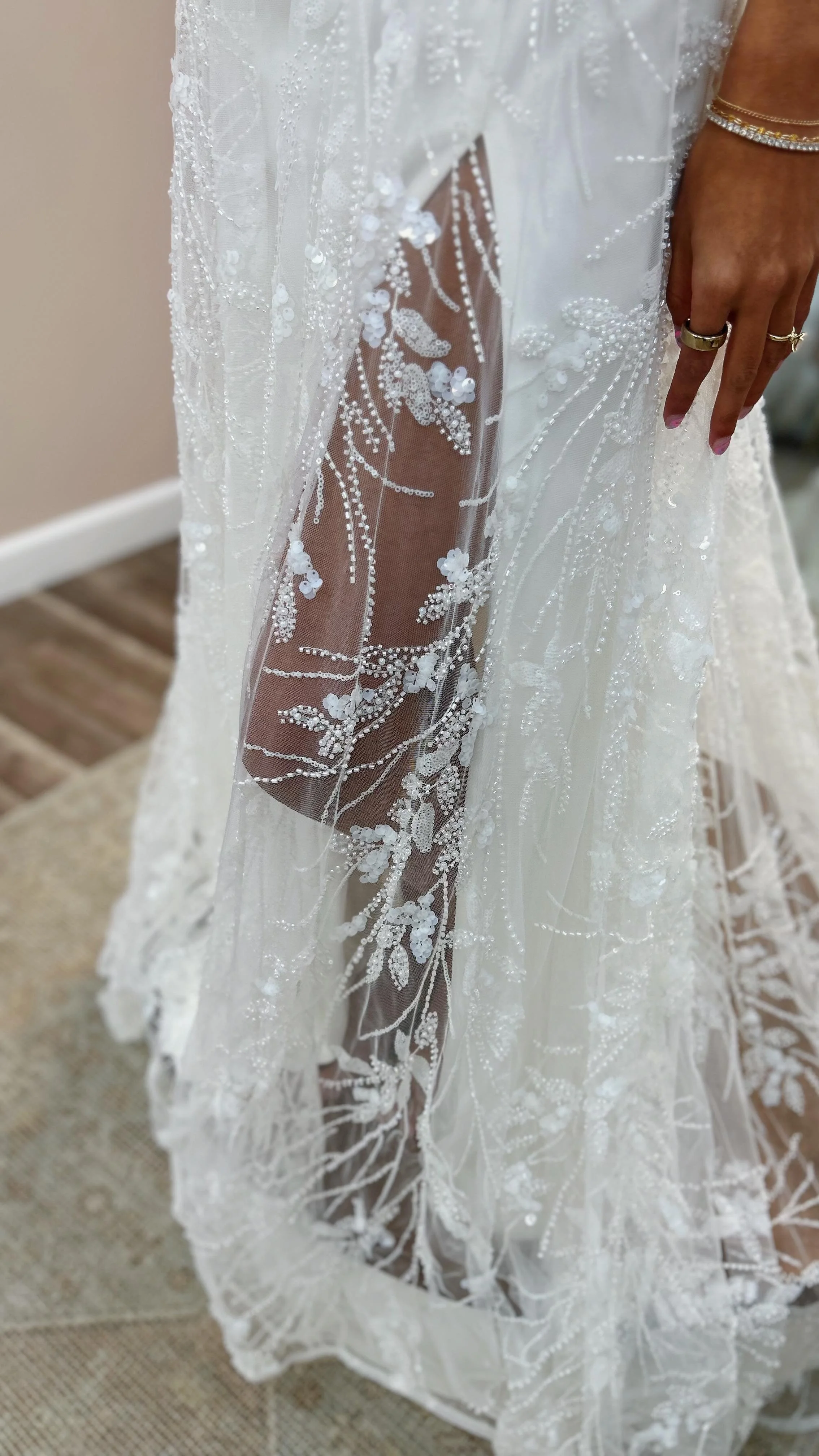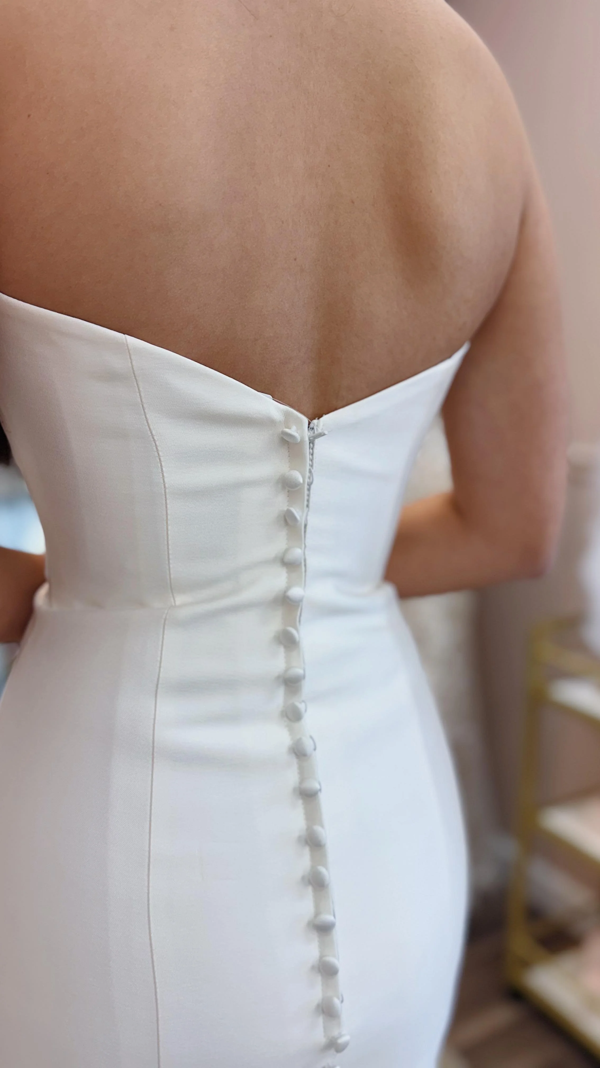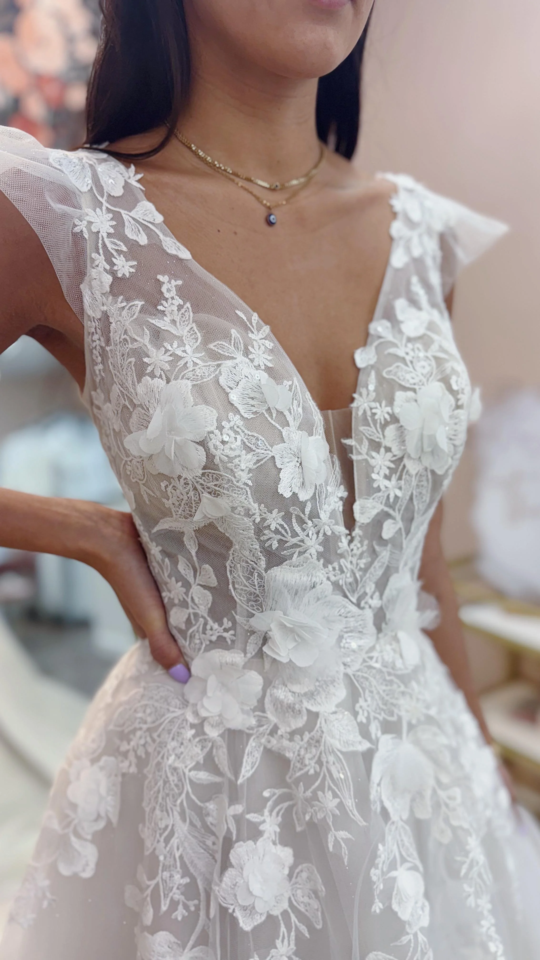 A majority of our bridal gowns were previous sample gowns from Something Blue. They have never been worn down the aisle by another bride. Wear and tear varies by how much they were tried on, pricing reflects the condition of each dress. We also carry a private designer which are brand new gowns bought exclusively for The One.