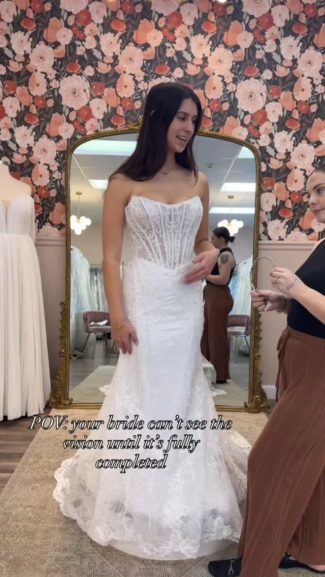 At Something Blue you try on sample gowns and then order a brand-new gown which typically takes 6-9 months to arrive.
